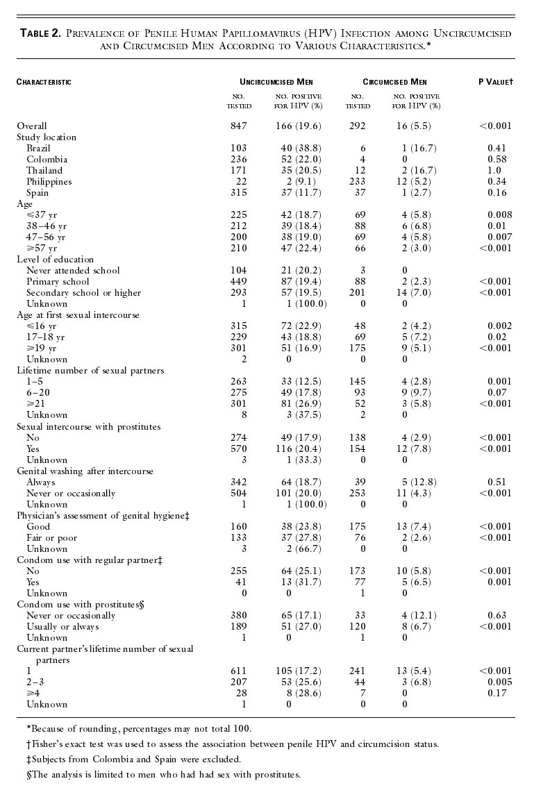 Results Study Subjects Of the 3790 women (1896 women with cervical cancer and 1894 controls) who were enrolled in the seven casecontrol studies, 2800 (1329 women with cervical cancer and 1471 controls) reported having a husband or stable male partner at study entry. A total of 984 of the 1329 partners of women with cervical cancer (74.0 percent) and 937 of the 1471 partners of control women (63.7 percent) were interviewed. Of these, 807 partners of patients (82.0 percent of those interviewed) and 717 partners of control women (76.5 percent) provided cytologic specimens, of which 610 (75.6 percent) and 533 (74.3 percent), respectively, yielded a valid PCR result. Eight men whose circumcision status was unknown (four with a valid PCR result and four who did not provide samples) were excluded from the analyses. [This whittling down of the numbers - from 3790 women down to 1143 partners - does not occur in a random way. These non-response figures influence the results in an unmeasured way, making statisticians suspicious of this kind of study.] Overall, the men whose HPV status could be confirmed by PCR assay were similar to the men whose HPV status could not be established with respect to age, level of education, circumcision status, and variables related to sexual behavior. In Colombia, highly educated men were more likely than less educated men to have a valid PCR result. In Thailand, uncircumcised men and men who reported having had a large number of sexual partners were more likely to have a valid PCR result than their counterparts. [There were only 40 circumcised "counterparts" in the Thai sample.] However, the exclusion of men from Thailand did not substantially alter the magnitude of the associations. Women whose partners participated in the study did not differ significantly from women whose partners did not participate with respect to age, level of education, or variables related to sexual behavior. Likewise, women whose partners were tested for HPV infection were similar to those whose partners were not tested. Characteristics of the Subjects The overall prevalence of self-reported circumcision was 19.3 percent (370 of 1913 men): 1.5 percent in Colombia [ie, hardly any], 6.1 percent in Brazil, 10.0 percent in Thailand, 11.5 percent in Spain [very few], and 91.0 percent [the great majority] in the Philippines. [So what purports to be a comparison of circumcision status is actually a comparison of countries.] As compared with uncircumcised men, circumcised men had a higher level of education, were less likely to report frequent genital washing after sex, [i.e. men in the Philippines differed in these ways from men in the other countries.] and were more likely to have good genital hygiene, as assessed by a physician (Table 1). [How much of that was physicians' perceptions of intact genitals as intrinsically less clean than circumcised?] View this table: [in this window] [in a new window] Table 1. Characteristics of Uncircumcised and Circumcised Men. [The table shows a perfectly baffling array of characteristics that have significant differences between cut and intact men - most probably because of the different countries they live in. They include sex with prostitutes, education, age at first intercourse, and use of condoms. The authors are simply fooling themselves if they think they can pool all this data and then correct for these differences, and others they have not considered, by statistical manipulation.] Circumcision and Penile HPV Infection HPV DNA was detected in 182 of the 1139 penile specimens (16.0 percent). The most common HPV genotypes were 16 (24.7 percent of all positive samples), 18 (4.9 percent), 6 or 11 (3.3 percent), 53 (3.3 percent), 31 (2.7 percent), and 33 (2.2 percent). The type could not be identified in the case of 51.1 percent of the positive samples. HPV types 35, 39, 45, 51, 52, 54, and 59 each accounted for less than 1.5 percent of the positive samples. HPV was detected in 19.6 percent of uncircumcised men (166 of 847) and 5.5 percent of circumcised men (16 of 292). As compared with uncircumcised men, circumcised men had a lower prevalence of HPV infection [detected] in all subgroups defined according to base-line characteristics [This might seem to mean that the "effect" of circumcision was more important than those characteristics, but it really just means that the effect of living in the Philippines was more important.] (Table 2). View this table: [in this window] [in a new window] Table 2. Prevalence of Penile Human Papillomavirus (HPV) Infection among Uncircumcised and Circumcised Men According to Various Characteristics.