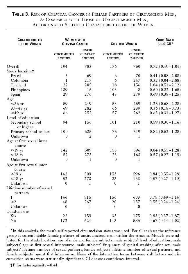 Circumcision and Cervical Cancer Male circumcision was associated with a moderate, but nonsignificant, decrease in the risk of cervical cancer in the men's female partners (odds ratio for self-reported circumcision, 0.72; 95 percent confidence interval, 0.49 to 1.04 [i.e. no significance]; odds ratio for clinician-confirmed circumcision, 0.69; 95 percent confidence interval, 0.43 to 1.11 [i.e. even less likelihood of significance]). There was no evidence of heterogeneity with respect to the location of the study (P=0.41), [This seems to refer to some kind of statistical manipulation of the data after they had pooled data from the different countries, none of which individually showed any correlation between circumcision and cervical cancer.] and the inverse association was not substantially altered by any of the characteristics of the women that we assessed (Table 3). Results were similar after the exclusion of men from Spain and Colombia (odds ratio, 0.79; 95 percent confidence interval, 0.47 to 1.33) and after the exclusion of men from the Philippines (odds ratio, 0.76; 95 percent confidence interval, 0.51 to 1.15). [Again, there is no need to exclude countries when the unpooled data from the separate countries is available.] View this table: [in this window] [in a new window] Table 3. Risk of Cervical Cancer in Female Partners of Circumcised Men, as Compared with Those of Uncircumcised Men, According to Selected Characteristics of the Women. [This table shows that the control group in the Philippines was only 111 couples, much smaller than the cervical cancer group (155 couples). The Philippines was the prime source of circumcised men. The essence of case-control studies is that the control group matches the case group as far as possible except in the variable being tested. It is not acceptable to use "controls" taken from another study in another country. Doing so greatly reduces the significance of the results.] To minimize confounding as a result of the women's having had male partners other than the current partner, we restricted the analysis to the 1420 men whose female partner reported having had only one sexual partner. [Cultural differences mean women in different countries may have been more or less ready to report having had other partners.] We also stratified this analysis according to several variables related to the male partner's sexual behavior in order to test the hypothesis that the reduction in the risk of cervical cancer would be greater among women whose male partners were at higher risk for HPV infection. As one measure of risk, we computed an index based on a man's age when he first had sexual intercourse and his total number of sexual partners. [ Early first intercourse does of course increase the time available to have more partners, but why should it increase the risk of HPV independent of the number of partners? The authors are data-mining.] Men who had had six or more sexual partners and who had first had intercourse before the age of 17 years were considered to be at high risk; men who had had five or fewer sexual partners and who were at least 17 years of age when they first had intercourse were considered to be at low risk; and the remaining men were classified as being at intermediate risk. [Did the authors devise this "high risk" characteristic before or after finding it associated with circumcision status?] The inverse relation between circumcision and the risk of cervical cancer [did not exist for women whose partners had had few other partners, but] was stronger and was significant in the case of women whose partners had a high risk index and [they mean, "that is"] who engaged in sexual practices known to increase the risk of exposure to HPV, such as having had intercourse before the age of 17 years, having had six or more sexual partners, and having a history of contact with prostitutes (Table 4). Tests for an interaction between circumcision status and the male partner's number of sexual partners and between circumcision status and the risk index were significant (P=0.03 and P=0.02, respectively). [Circumcised men who used prostitutes were more likely to use condoms than intact men. This would affect HPV rate.] View this table: [in this window] [in a new window] Table 4. Risk of Cervical Cancer in the Monogamous Female Partners of Circumcised Men, as Compared with Those of Uncircumcised Men, According to Selected Characteristics of the Men. Discussion In our study, male circumcision was associated with a reduced risk of penile HPV infection in men. [..."associated" through the accident of living in the Philippines.] We also found an inverse association between circumcision and the risk of cervical cancer was significant among women whose male partners engaged in sexual practices known to increase the risk of infection with HPV, such as having had multiple sexual partners. [What they did NOT find was an association between intact partners and cervical cancer.] The assessment of the reliability and validity of self-reported circumcision status has yielded inconsistent results,8,28,29,30 and potential misclassification of circumcision status with the use of this method has been a major concern in previous studies. One strength of our study is the high rate of accuracy of self-reported circumcision status. Medical examination of the penis, performed in 43 percent of the men, confirmed the self-reported circumcision status in 95 percent of those examined. [Since fewer than half were examined, the accuracy of self-reporting may be somewhat less than 95%, and then the statistical effects of mis-assignment destroy the slim margins of confidence in the other measures shown here.] Inverse associations with the risks of penile HPV infection and cervical cancer were similar when circumcision status was classified according to self-report or medical examination. Likewise, the exclusion of subjects who had not undergone a penile examination (men from Spain and C