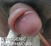 This is one of the very few things that can go seriously wrong with an intact penis and not a circumcised one. (So it's a wonder it hasn't been heavily promoted as a reason to circumcise babies.) How to bring it back ![]() If the patient is a child, the person reducing the paraphimosis by this method needs to know that the process will hurt, but only momentarily. One good way to reduce the swelling is by covering the penis in ordinary (granulated) sugar. This draws the fluid out of the penis by osmosis (the old high school water-through-a-membrane trick). If this fails, it is important to see a doctor. S/he can draw off the fluid with a hypodermic needle or, as a last resort, cut through the tight band. Recently another method has been recommended, the "Dundee technique". This involves pricking the swollen prepuce about 20 times (under anaesthetic) and letting the fluid escape. The doctor may then recommend circumcision or try to order it, maybe telling you tales of necrosis, gangrene and autoamputation ("You penis will fall off!") to scare you into it. Circumcision will remove any chance of this happening again. But if the doctor has put a slit in your foreskin, that is probably enough and it won't happen again. Otherwise, it's up to you whether you think you can trust yourself to act in time next time - as you did this time. You're hardly likely not to notice that your foreskin is retracted. It also depends how much you value your foreskin. The commonest cause of paraphimosis is iatrogenic (doctor-caused), when a catheter (drainage tube) is put in your penis and your foreskin is not brought forward again - probably because the doctor or nurse is unfamiliar with the normal foreskin. (Picture of a iatrogenic paraphimosis. Note the catheter.) The catheter pushing out from inside and the foreskin constricting from outside combine to produce the paraphimosis. The catheter needs to be removed before the paraphimosis is reduced. No catheter, no paraphimosis, and no need for circumcision. The catheter can be put back, the foreskin pulled forwards and paraphimosis will not occur again. Veteran Intactivist Marilyn Milos RN writes: