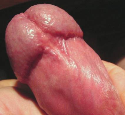 scrotal skin is drawn half way up the shaft, while the glans is tilted