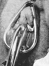Circumcision forceps Invented by a Dr Moskovich in 1920, apparently for adult circumcision, but they look more as though they should be used to blow bubbles. ![]() The top ring was introduced into the preputial cavity - somehow - and the foreskin fanned out between the two rings. After cutting round it, seven sutures could be made in the notches. It had the obvious problem of the place where the forceps attach to the rings. The rings also left a collar of skin round the glans. Less obvious, it can't apply much pressure over so large an area, but it was the first circumcision device to acknowledge that the prepuce is, more or less, circular.