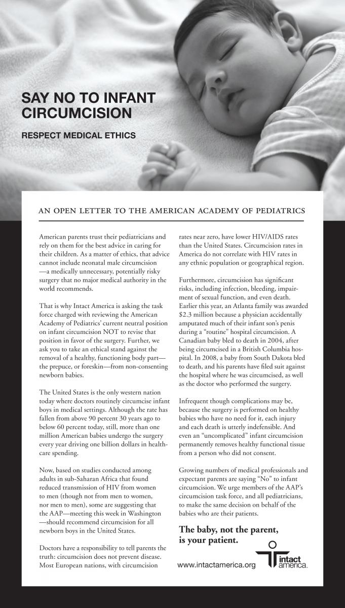 AN OPEN LETTER TO THE AMERICAN ACADEMY OF PEDIATRICS American parents trust their pediatricians and rely on them for the best advice in caring for their children. As a matter of ethics, that advice cannot include neonatal male circumcision-a medically unnecessary, potentially risky surgery that no major medical authority in the world recommends. That is why Intact America is asking the task force charged with reviewing the American Academy of Pediatrics' current neutral position on infant circumcision NOT to revise that position in favor of the surgery. Further, we ask you to take an ethical stand against the removal of a healthy, functioning body part- the prepuce, or foreskin-from non-consenting newborn babies. The United States is the only western nation today where doctors routinely circumcise infant boys in medical settings. Although the rate has fallen from above 9O percent 30 years ago to below 60 percent today, still, more than one million American babies undergo the surgery every year driving one billion dollars in health-care spending. Now, based on studies conducted among adults in sub-Saharan Africa that found reduced transmission of HIV from women to men (though not from men to women, nor men to men), some are suggesting that the AAP-meeting this week in Washington-should recommend circumcision for all newborn hoys in the United States. Doctors have a responsibility to tell parents the truth: circumcision does not prevent disease. Most European nations, with circumcision rates near zero, have lower HIV/AIDS rates than the United States. Circumcision rates in America do not correlate with HIV rates in any ethnic population or geographical region. Furthermore, circumcision has significant risks, including infection, bleeding, impairment of sexual function, and even death. Earlier this year, an Atlanta family was awarded $2.3 million because a physician accidentally amputated much of their infant son's penis during a "routine" hospital circumcision. A Canadian baby bled to death in 2004, after being circumcised in a British Columbia hospital. In 2008, a baby from South Dakota bled to death, and his parents have filed suit against the hospital where he was circumcised, as well as the doctor who performed the surgery. Infrequent though complications may be, because the surgery is performed on healthy babies who have no need for it, each injury and each death is utterly indefensible. And even an "uncomplicated" infant circumcision permanently removes healthy functional tissue from a person who did not consent. Growing numbers of medical professionals and expectant parents are saying "No" to infant circumcision. We urge members of the AAP's circumcision task force, and all pediatricians, to make the same decision on behalf of the babies who are their patients. The baby, not the parent, is your patient. intact america www.intactamerica.org [... and there is nothing the matter with him.] |